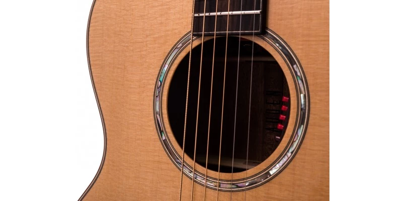 Not only do you get top quality hand built instrument you also get spectacular hardware. The Auden Chester OOO has the Brad Clark Supernatural Pre-amp, an all-new system that has left us highly impressed here at Merchant City Music. The Supernatural comprises two sensors: 1) Super Discrete Power bridge sensor (SDP) and 2) the Supernatural face sensor (FS). These are inputted into a programmable preamplifier. The sounds are “tuned” by professional musicians and pre-stored into the chip. There are four presets of sounds to suit most guitars, scenarios and styles. This system claims to provide unprecedented realism and flexibility, and, having experienced it, we’d have to agree! It is also incredibly lightweight, and does not compromise the guitar’s acoustic performance.