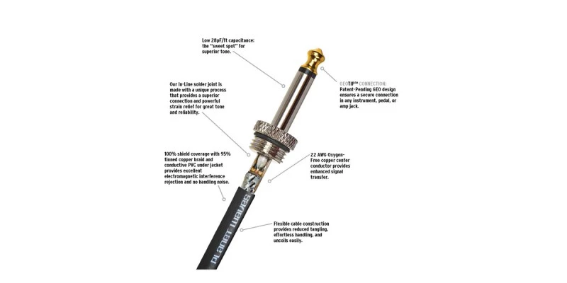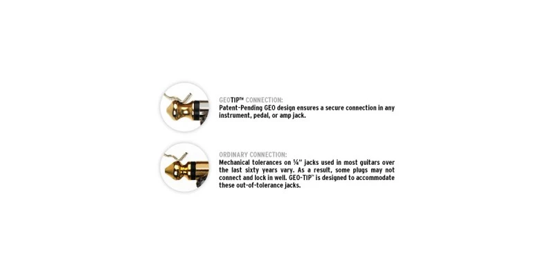 D’Addario’s patented Geo-Tip: Gives you the most secure connection possible. Ordinary cables tips don’t allow for varying jack tolerances. But the D’Addario-designed patented Geo-Tip works with any jack to give you the most secure, trustworthy connection possible.