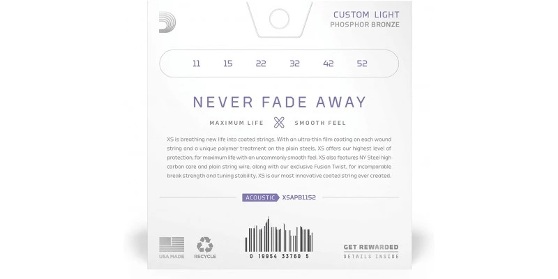 D’Addario XS Acoustic Phosphor Bronze strings combine the most popular acoustic alloy with D’Addario’s most advanced string coating technology, resulting in clear tone, smooth feel, and superior tuning stability – all with the longest possible string life. With its ultra-thin film coating on every wound string and a unique polymer treatment on the plain steels, XS offers the highest level of protection for maximum life. XS also features NY Steel high carbon core and plain string wire, and exclusive Fusion Twist, for outstanding break strength and tuning stability. XS is the most innovative coated string D’Addario have ever created.