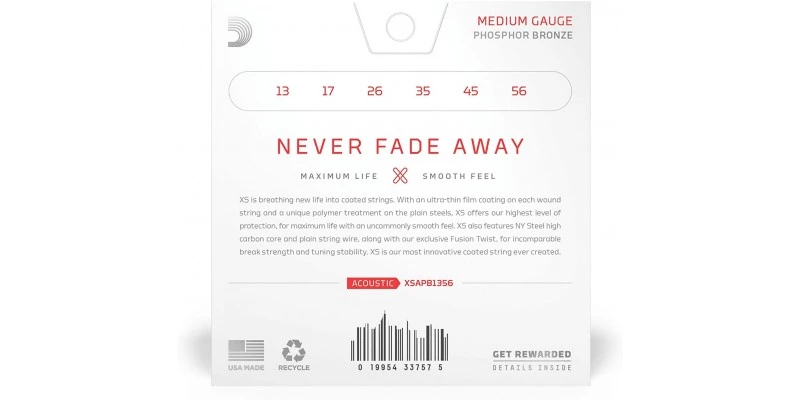 D’Addario XS Acoustic Phosphor Bronze strings combine the most popular acoustic alloy with D’Addario’s most advanced string coating technology, resulting in clear tone, smooth feel, and superior tuning stability – all with the longest possible string life. With its ultra-thin film coating on every wound string and a unique polymer treatment on the plain steels, XS offers the highest level of protection for maximum life. XS also features NY Steel high carbon core and plain string wire, and exclusive Fusion Twist, for outstanding break strength and tuning stability. XS is the most innovative coated string D’Addario have ever created.