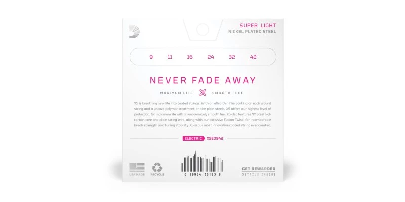 XS is breathing new life into coated strings. With its ultra-thin film coating on every wound string and unique polymer treatment on the plain steels, XS offers our highest level of protection for maximum life with an uncommonly smooth feel. XS also features NY Steel high carbon core and plain string wire, along with our exclusive Fusion Twist, for incomparable break strength and tuning stability. XS is the most innovative coated string ever created.