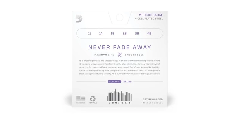 XS Nickel coated electric guitar strings provide the longest life of any D’Addario electric guitar string. Coated with D’Addario’s groundbreaking XS coating, these premium electric strings achieve maximum life and a smooth, fast feel without dampening their outstanding tone. Constructed with a NY Steel core, reformulated nickel-plated steel wrap wire, and Fusion Twist technology, XS Nickel strings boast superior strength and tuning stability, plus richer harmonics, greater clarity, and remarkable definition with every sweep, slide, and bend. This 11-49 Medium gauge set provides increased volume, with slightly more tension and resistance.
