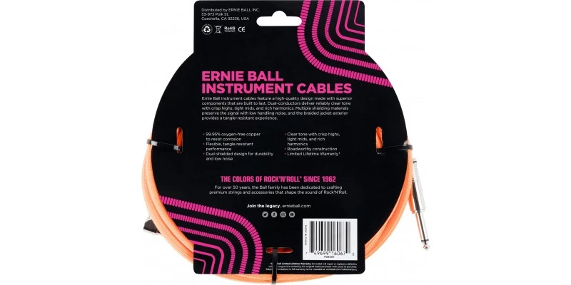 The Ernie Ball 25 Foot Braided Straight/Angle Instrument Cable – here in Neon Orange – seamlessly combines stand-out looks with superior performance. These cables have a really substantial feel to them, borne out by the specs. Dual-shielding ensures super-low noise performance and durability. The braided exterior not only looks great, but also helps prevent tangling, while the cabling itself is 99.95 oxygen-free, practically eliminating the potential for corrosion. The jack ends are unscrewable for servicing, and the cable is additionally covered by a limited lifetime warranty, meaning that Ernie Ball will replace any defective cable (with proof of purchase) while owned by the original purchaser.