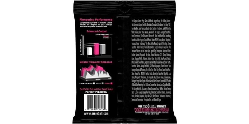 Ernie Ball Cobalt Super Slinky guitar strings are made from a special type of alloy which is attracted to an electric guitars pickup magnets more so than traditional guitar string materials.