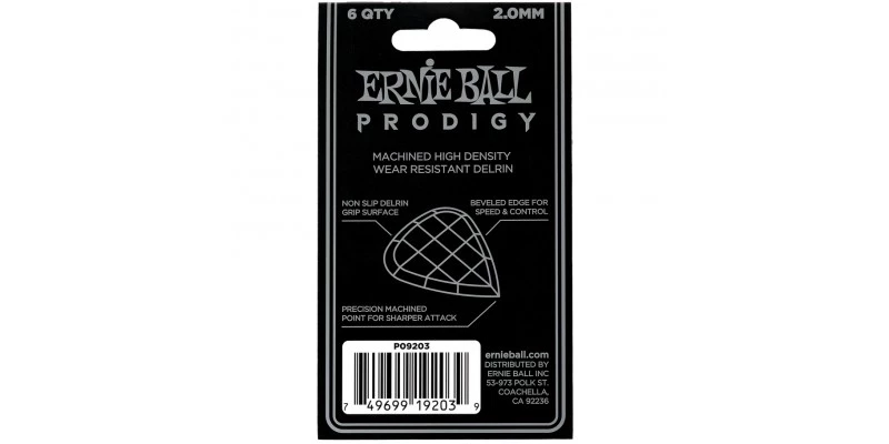 Ernie Ball Prodigy picks feature highly durable Delrin material for a more secure non-slip surface. The machined beveled edge and sharp point at bottom allow for less drag, added articulation, and precise control while playing.