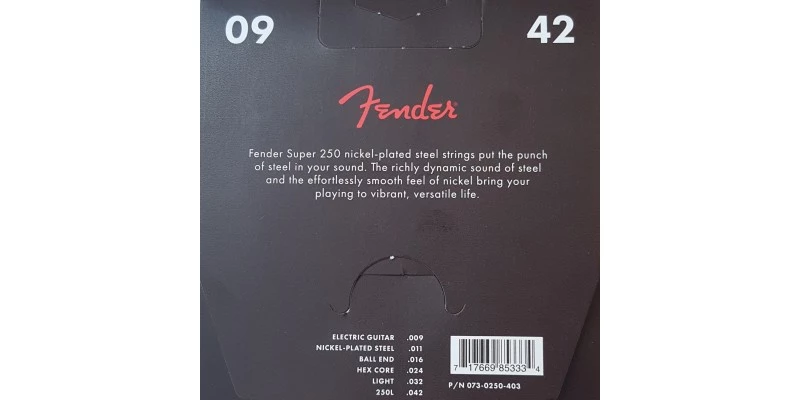 Fender 250L Super 250 Guitar Strings 9-42 are manufactured using nickel plated steel. Using these Light Gauge Super 250’s will give your instrument plenty of volume and dynamics. They also provide plenty of Bite and work well with Fender guitars.