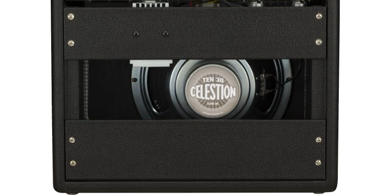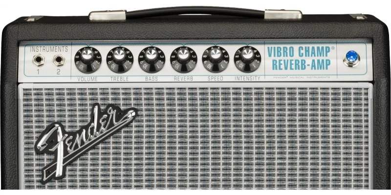 - Unique Features: Modified Vibro Champ circuitry, custom-made Schumacher transformers (like the originals), 10″ Celestion® 3.2 ohm speaker for increased bass response, Fender hall reverb and tube-driven tremolo, 1968-style silver-panel aluminum trim and silver-turquoise grille cloth