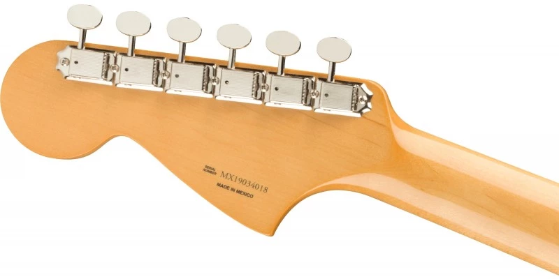 The pair of single-coil Jaguar pickups sound and feel more like the originals—keeping the focusing cages for authentic, vintage-style tone and looks. The chiming neck pickup is tempered by the bright, aggressive bridge pickup. The “Mid 60s C”-shaped neck has a 7.25”-radius fingerboard with 22 vintage-style frets for classic playing feel. Vintage-style Jaguar bridge, tremolo and tuning machines provide original-era aesthetics, rock-solid performance and tuning stability. Other features include the classic lead/rhythm circuit, chrome hardware and 4-bolt neck plate. Includes a deluxe gig bag.
