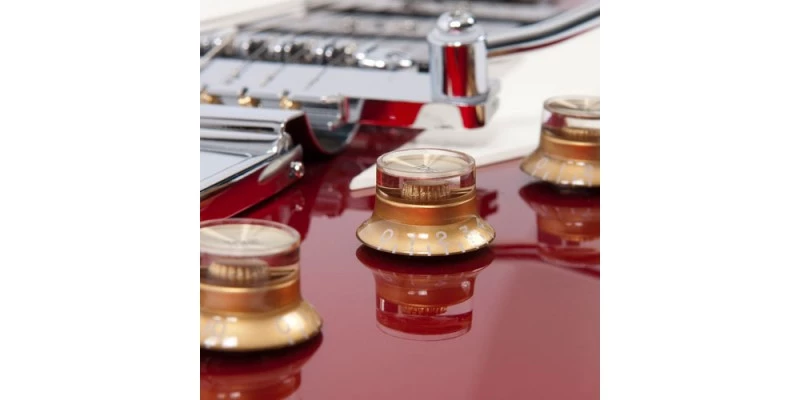 The long tenon set-neck construction, combining a three-piece centre block agathis body with fast-playing maple neck with rosewood fingerboard, creates a solid platform for you to build your Esprit III’s tone. The distinctive reversed six-a-side in-line peghead, asymmetric body and WP90s, vintage ’60s ‘Long Tail’ vibrato and signature oversized pickguard all add up to a real statement of style with attitude. The reverse string tension and three stacked Fret-King WP90s give the Esprit III a huge range of core sounds. Master volume and master tone add to the dynamic and tonal range, while the Fret-King Vari-coil allows each of the stacked pickups to be rolled progressively back to single coil.