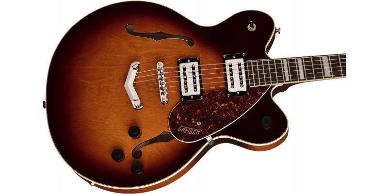 The Gretsch G2622 Streamliner Center Block Double-Cut with V-Stoptail is here presented in Forge Glow Maple with 3-ply tortoiseshell pickguard. With a laminated maple body and solid spruce centre block, the G2622 produces the powerful sound for which Gretsch’s semi acoustic’s have become known and loved. The high output Broad’Tron BT-2S are the perfect accompaniment for this body, while the Gretsch V-Stoptail tailpiece and anchored Adjusto-Matic bridge provide rock solid tuning stability.