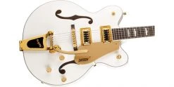 Alive and resonant, the G5422TG also features a versatile upgraded control layout including master volume with treble bleed circuit, master tone, individual pickup volume controls and three-position pickup toggle switch, oversized bound F-holes, multi-ply body binding, smaller late-’50s G6120 bound headstock, vintage-style open-back tuning machines, Graph Tech NuBone nut, pearloid Hump Block inlays, secured Adjusto-Matic bridge and a Bigsby B60 vibrato tailpiece.
