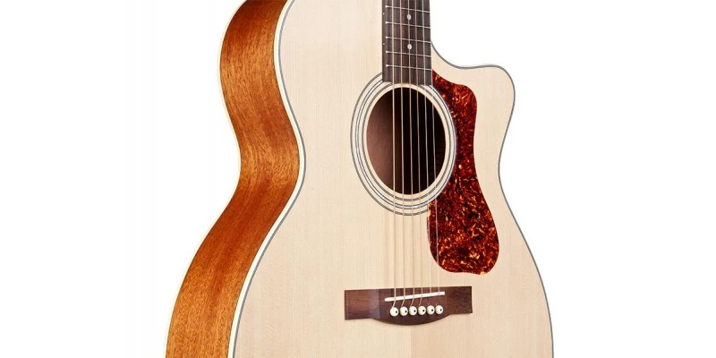 The Archback Cutaway Guild OM-240CE Westerly in Natural features a solid top and a bone nut and saddle.