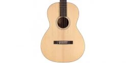 The Guild P-240 Memoir is a diminutive Parlour Guitar, designed to be perfect for fingerpicking and platpicking. Vintage cues abound in the aesthetic of this guitar, from the classic logo on the slotted headstock, to the rectangular bridge and simple rosette. A solid spruce top and mahogany back and sides provide suitably vintage tone, while the 12th fret body join results in a more mellow sound.