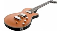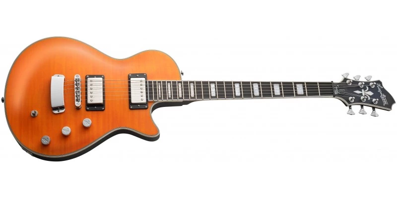 The Ultra Max shares the same small body concept of the Ultra Swede, yet with a slightly larger proportioned mahogany body topped with a thick custom carved flame maple top. The body joins to a mahogany set neck utilising a mortise and tenon neck joint with a 25.50” scale length, which naturally features Hagstrom’s H-Expander™ truss-rod and Resinator™ fingerboard. Its sleek and “ultra-comfortable fast neck” is paralleled with Custom 60 Alnico-5 pickups with their eloquent Aluminium Brushed covers, delivering the cutting voice that this instrument demands.