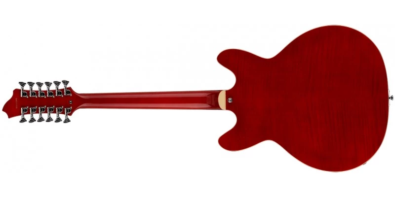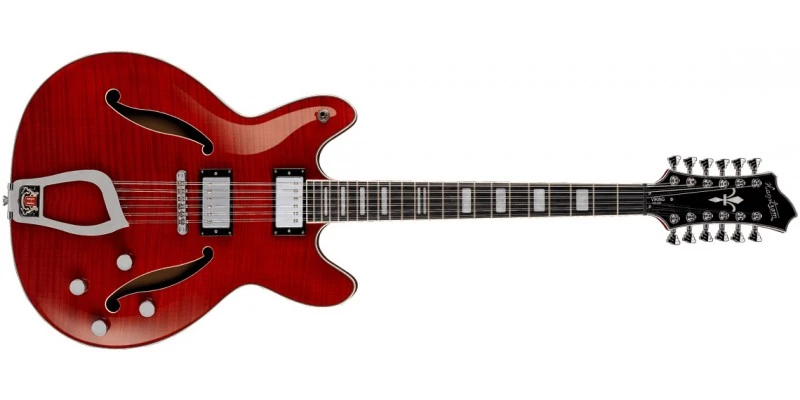 More than 200 pounds of pressure are exerted on the neck of a 12-string guitar, a problem for traditional guitar designs. However, Hagstrom’s unique H-Expander™ truss rod, inspired by designs used in jet aircraft manufactured in Sweden by Saab, handles this with no problem, and even allows for an incredibly thin neck for playing comfort with no compromise in stability. Your neck will stay straight for years to come with the Hagstrom Viking Deluxe 12-string Wild Cherry Transparent.