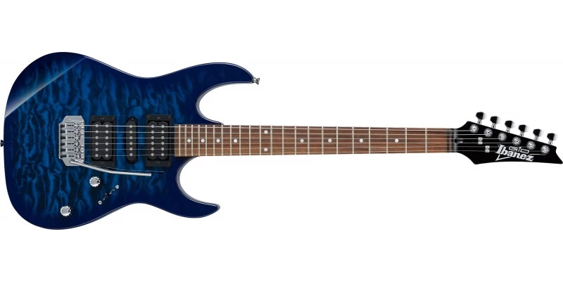 The GIO Ibanez GRX70QA in Transparent Blue Burst features a quilted maple art grain top. It makes an excellent Beginners Guitar.