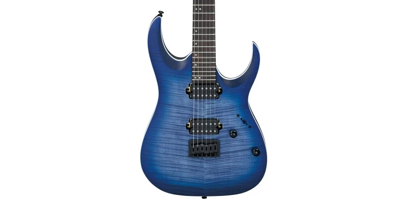The Ibanez RGA42FM in Blue Lagoon Burst Flat features a flamed maple top and mahogany body.