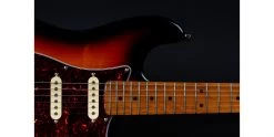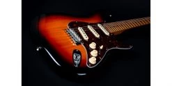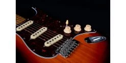 In terms of hardware, a vintage-style synchonised tremolo has been fitted, along with chrome closed-gear tuners. The bone nut ensures that all vibrations from the strings are transferred to the three ceramic single-coil pickups. These are controlled via the classic volume / 2 x tone knobs and 5-way switch layout.