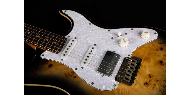 With a lightweight and resonant Basswood body – here topped with Burl Poplar – combined with a Roasted Canadian Maple neck / Rosewood fretboard, the Jet JS-450 gets off to a very good start. This guitar really has looks to die for, with a rich gloss Transparent Brown finish allowing the Burl Poplar top to show through to full effect. Aged plastic knobs and pickup covers are offset by the Pearloid pickguard for a premium look which complements the caramel hue of the neck.