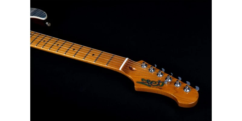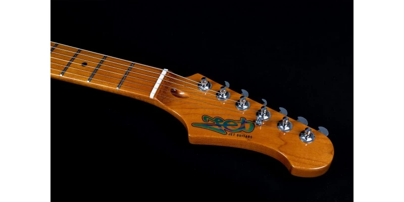 With a lightweight and resonant Basswood body – here topped with Flamed Maple – combined with a Roasted Canadian Maple neck / fretboard, the Jet JS-450 gets off to a very good start. This guitar really has looks to die for, with a rich gloss Transparent Black finish allowing the Flamed Maple top to show through to full effect. Aged plastic knobs and pickup covers are offset by the Pearloid pickguard for a premium look which complements the caramel hue of the neck.
