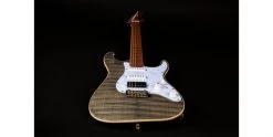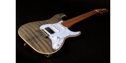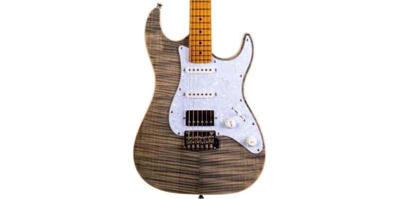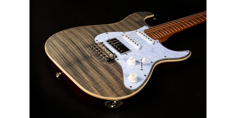 With a phenomenal spec sheet and build quality for the price, the Jet JS-450 S-Style electric guitar is here presented in Transparent Black with Flamed Maple top and Roasted Maple Fretboard. Jet guitars are inspired by classic high end guitars, and they really do look and feel much more expensive than they in fact are! In addition to the stunning flamed maple top, the JS-450 is upgraded with a 2-Point Wilkinson Tremolo system, Pearloid Pickguard, Cream body binding and locking tuners. It produces a hugely versatile range of tones, thanks to its HSS pickup configuration.