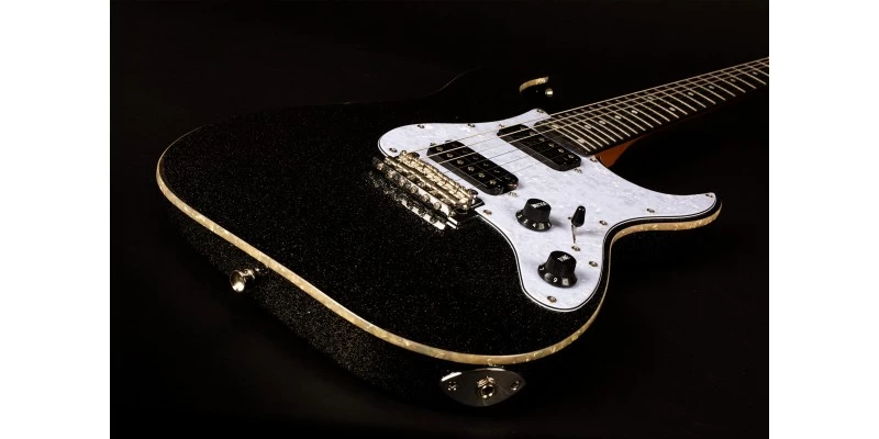 With a lightweight and resonant Basswood body combined with a Roasted Canadian Maple neck, the Jet JS-500 gets off to a very good start. This guitar really has looks to die for, with a rich gloss Black Sparkle finish and body-matching headstock. Black knobs and pickup covers are offset by the Pearloid pickguard for a premium look which complements the caramel hue of the neck and black mixed Ebony fretboard.