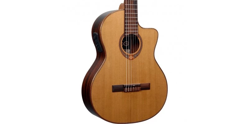 The LAG OC118CE Occitania 118 is an Electro-Classical Guitar from this respected French luthier. This guitar has a solid Red Cedar top, combined with Khaya back and sides, resulting in a warm, mellow tonality. The cutaway body facilitates easy upper fret access, while the built-in Astro-LÂG preamp allows quick and accurate amplified performance.
