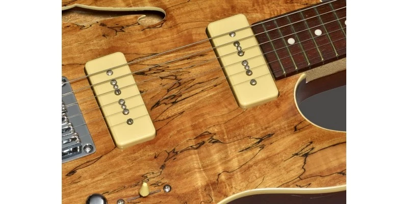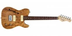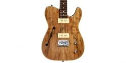The Michael Kelly 59 Thinline is here presented in a natural Spalted Maple finish. This guitar combines boutique looks with tone defined by a chambered mahogany body and twin P90 single-coil pickups. Easy playability is assured, thanks to the modern “C” Shape neck profile, while cream body binding completes the up-market aesthetic.