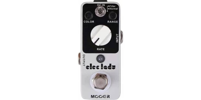 The Mooer Eleclady is a classic analog flanger pedal with filter mode and oscillator effects. It has 2 working modes: Normal and Filter. It is housed in a very small and exquisite full metal shell. It is true bypass and requires a DC 9V Adapter power supply.