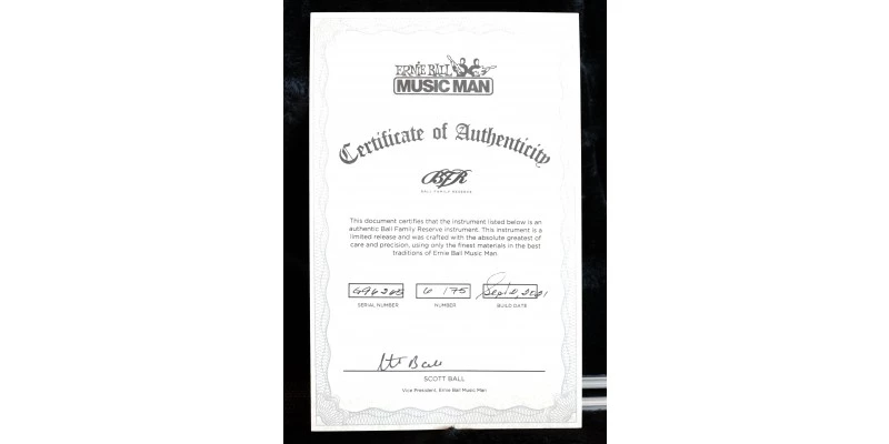 The Ball Family Reserve Albert Lee HH Cherry Punch features dual Ernie Ball Music Man humbucking pickups enhanced by an exclusive custom cherry burst sparkle finish. The lightweight Okoume body is pickguard-free with a fully buffed top and back, showcasing the exquisite cherry burst color coat. A highly figured roasted maple neck and fingerboard is accented with white block inlays and 22 stainless steel frets. This special BFR edition guitar comes with a Tune-O-Matic stop tail bridge, natural headstock, and Schaller locking tuners. The overall aesthetic package is enhanced by an Albert Lee autographed control cover on the back and all chrome hardware. Limited to 75 pieces worldwide.