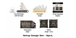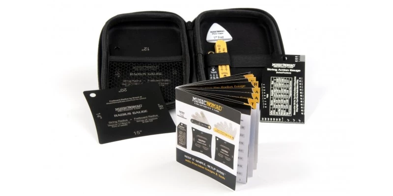 The Set includes: Truss Rod Gauge, Pick Capo, String Action Gauge, 2 Radius Gauges, & Nut Height Gauge. It even includes a 24 page instructional booklet & carrying case. That’s Music Nomad quality – raising the bar in equipment care.