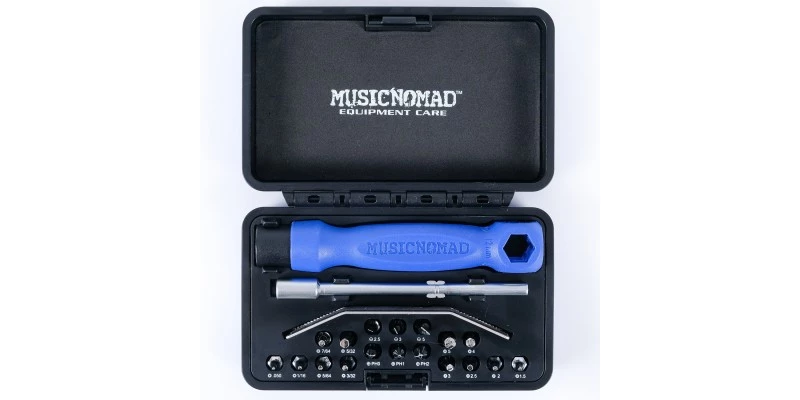 The MusicNomad Premium Guitar Tech Screwdriver And Wrench Set MN229 includes everything you need to adjust your guitar. Includes: 18 bits, 7 hex wrench sizes and MusicNomad’s Premium Spanner Wrench (MN224). It all comes in a compact, lightweight and strong aluminium case for easy transportation.