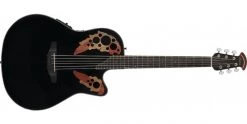 The Ovation Celebrity Elite Electro-Acoustic Guitar is here presented in a Black finish with Solid Spruce top. This CE44-5 model features Ovation’s Mid Depth Lyrachord roundback body, which provides a resonant and consistent foundation for the Spruce. Ovation’s OP-4CT preamp and CP-100 pickup transform this guitar into an outstanding stage instrument.