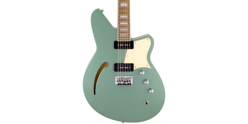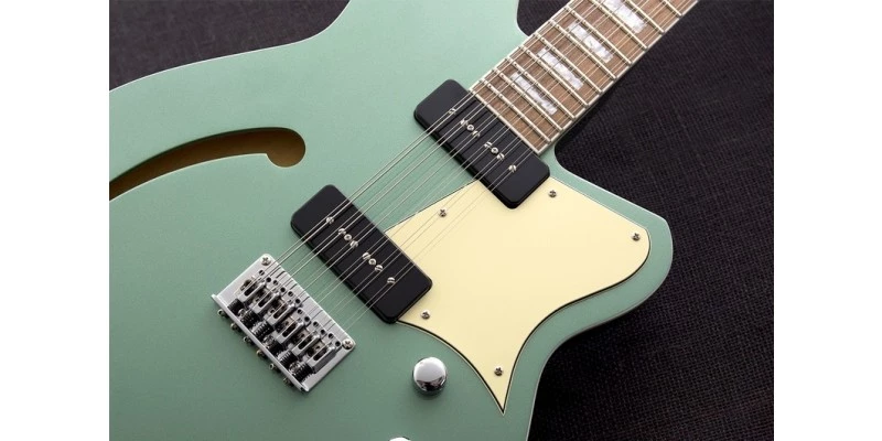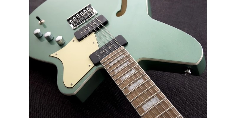 Reverend have produced an outstanding 12 string electric guitar in the Airwave. The shorter 24-3/4″ scale provides lower string tension making it far easier to play than regular 12 strings. A 1-3/4″ nut provides proper spacing for the extra strings. Seriously, this is by far the easiest to play 12 string guitar we have ever come across. It also intonates perfectly thanks to a bridge that is fully intonateable for all 12 strings independently. Chords are always in tune and sound sweeter than you’d expect. The offset double cut semi-hollow body is made from Korina with a solid Spruce top.