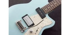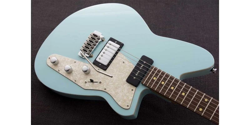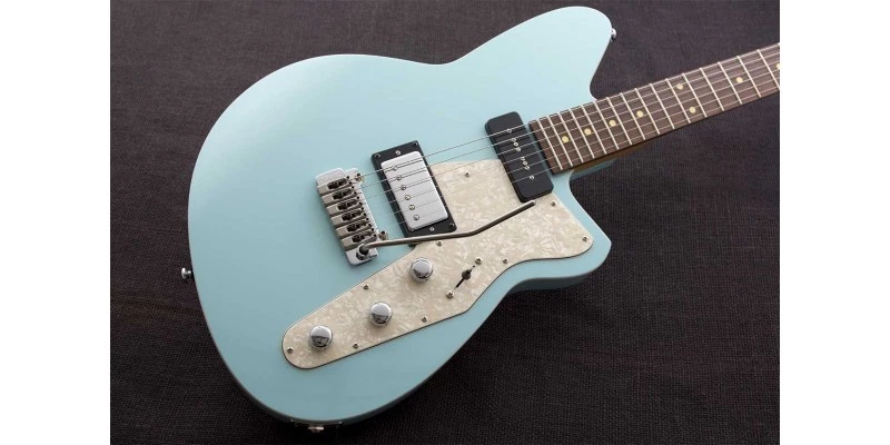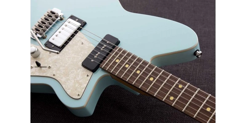 A quick review of the features this guitar has to offer will tell you it’s different. Using korina to build an offset body is a great decision. A wood normally reserved for boutique instruments it is very lively sounding. The Chronic Blue finish on the body looks stunning, and is set off perfectly by the Pearloid Pickguard pickguard. The Reverend Double Agent W features a Roasted Maple neck and Rosewood fretboard. The medium oval profile is very comfortable. It features a twelve inch radius and medium jumbo frets. Roasted Maple is normally used on custom shop and high-end boutique built guitars. Reverend have brought this material to a price bracket never seen before. The Roasted Maple that Reverend have used has been kiln dried to remove most of the moisture. This results in a neck resistant to temperature and humidity. The advantages also include stability and increased resonance.