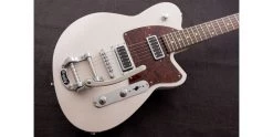 Reverend have also now fitted a Bigsby B-50 trem system, but not without some modifications of their own. Reverend’s secret weapon for Bigsby’s is their soft-touch spring, which transforms the feel for a much more intuitive “broken in” action. This is combined with Reverend’s own roller bridge and Boneite nut, resulting in a supremely smooth vibrato which would be almost unrecognisable to Bigsby users of old. Reverend’s pin lock tuners are also an integral part of the picture, providing a highly stable foundation which allows the vibrato to be operated without fear of nasty string slippages.