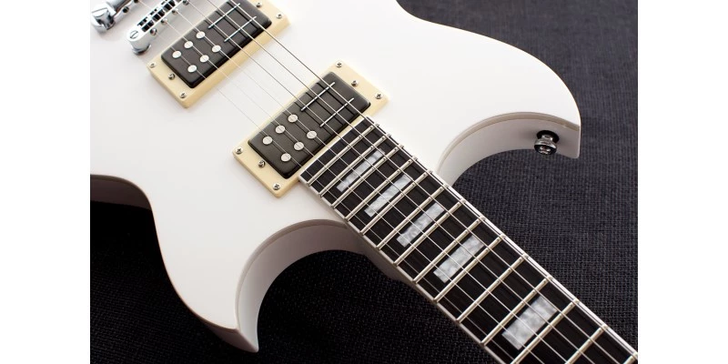 The Robin Finck Signature in Ice White comes with a 12” radius Ebony fretboard. The 22 medium jumbo frets are beautifully finished, allowing the action to go nice and low without buzz. The overall result is a slick-playing feel, ready to crush your leads!