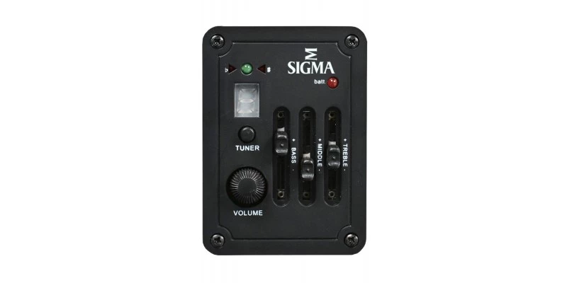 The Sigma 000M-1E is a 000-size electro-acoustic guitar with solid Sitka Spruce top and Mahogany back and sides. This UK-exclusive model comes fitted with a Sigma Preamp with built-in electronic tuner for easy on-stage performance. A subtle premium look is provided by the high gloss finish and black body binding.