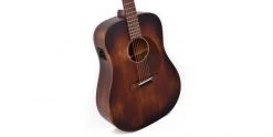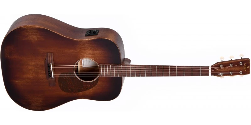The Sigma DM-15E Aged is an all-mahogany dreadnought electro-acoustic guitar with an aged finish. With a rich and full voice, the DM-15E Aged also performs with the character you’d expect of an instrument which has spent decades being played in. It’s solid soundboard ensures that it will only sound better as time goes on.