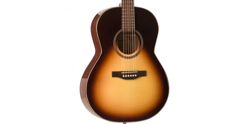 The Simon & Patrick Woodland Pro Folk Sunburst is an all solid wood acoustic guitar made in Canada.