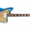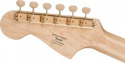 The Squier 40th Anniversary Jazzmaster, Gold Edition is a stylish model adorned with an eye-catching collection of upscale features for the discerning Squier fanatic. Featuring striking gold-plated hardware, a gold anodized aluminum pickguard, a bound Indian laurel fingerboard with pearloid block inlays, an engraved anniversary neck plate and gloss finish throughout, this Jazzmaster is poised and ready for the spotlight. Player-friendly refinements of this commemorative model include a slim and comfortable “C”-shaped neck profile for an easy playing feel, vintage-style tuning machines and 6-saddle floating bridge and tremolo for authentic performance and style, and Fender-Designed single-coil pickups with alnico 5 magnets for familiar Jazzmaster tone.