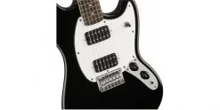 The Squier Bullet Mustang HH in Black features a shorter 24 inch scale length and a hard tail.