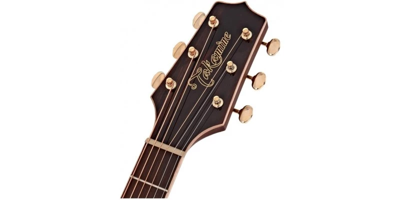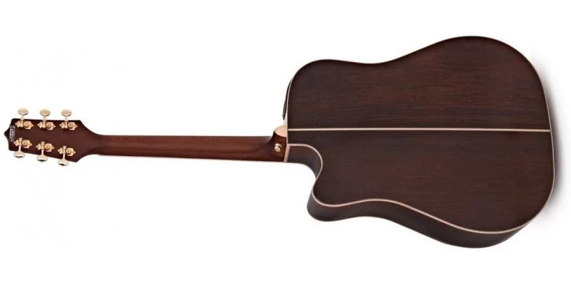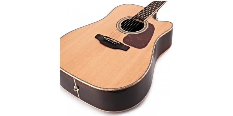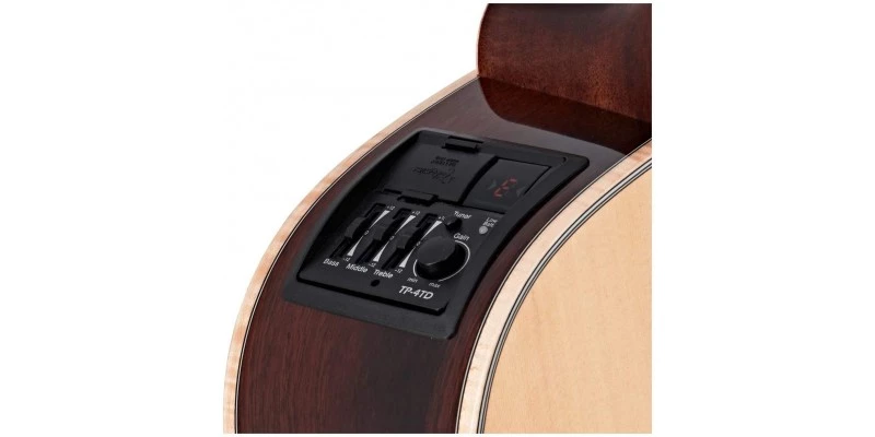 The slim mahogany neck and 12″-radius bound Rosewood fingerboard provide great feel and playability, while the onboard Takamine TP-4TD preamp system gives you a built-in tuner, three-band EQ and gain controls for a high level of versatility and sound quality. Other premium features include maple body, neck and headstock binding; Abalone ring rosette; synthetic bone nut and split bridge saddle; Rosewood headcap; abalone dot inlays; gold die-cast tuners buttons; and a beautiful gloss finish.