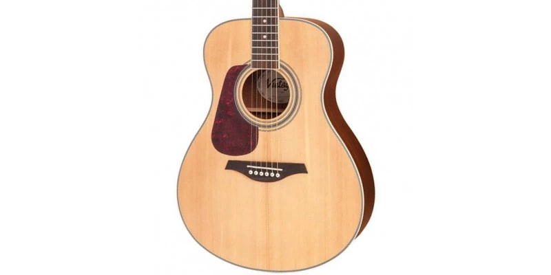 The Vintage V300 Left Handed has been one of our best selling lefty acoustic guitars for years. When you check out the specification and the price it is easy to see why. They always get a great review. This natural finish version also includes a beginners guitar starter package. This includes a gig bag, strap, tuner, and plectrums. Everything you would need to get started. The folk sized body of the V300 is supremely comfortable to sit with. Another reason that makes it a great starter acoustic. It features a solid spruce top that gives it a richer, warmer sound than a plywood instrument. The more it is played, the better it will sound. The Nato neck has a trim profile making it easy to get around.