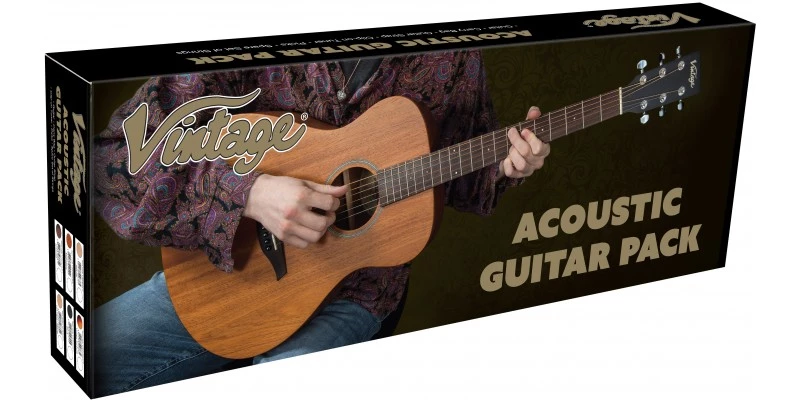 Natural Vintage V300 Acoustic Guitar Package with a padded gig bag, electronic tuner, strap, spare strings and a plectrum.