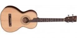 This tenor guitar is surprisingly versatile. A very capable all-rounder. The Vintage VTE800N has been designed in conjunction with Paul Brett. It has been based around a parlour sized acoustic guitar. The tuning as standard would be C, G, D, A. This is 5ths. This is just a starting point though. Construction utilises solid spruce for the top. It has excellent projection thanks to Sapele laminated back and sides. The Vintage VTE800N Viaten Paul Brett also comes with its own gig bag.